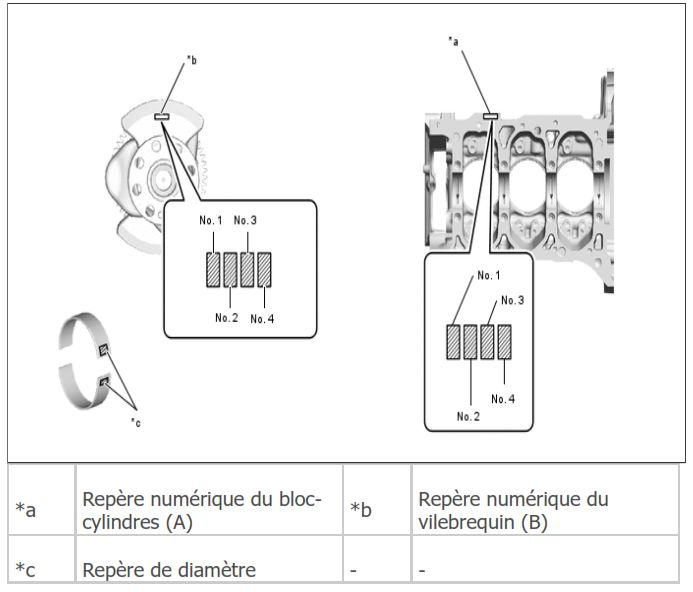 Pour faire le bon reportez vous à la 2ème image, le numéro de coussinet est gravé sur le bloc moteur, sur le coussinet, et sur les coussinets eux-mêmes.