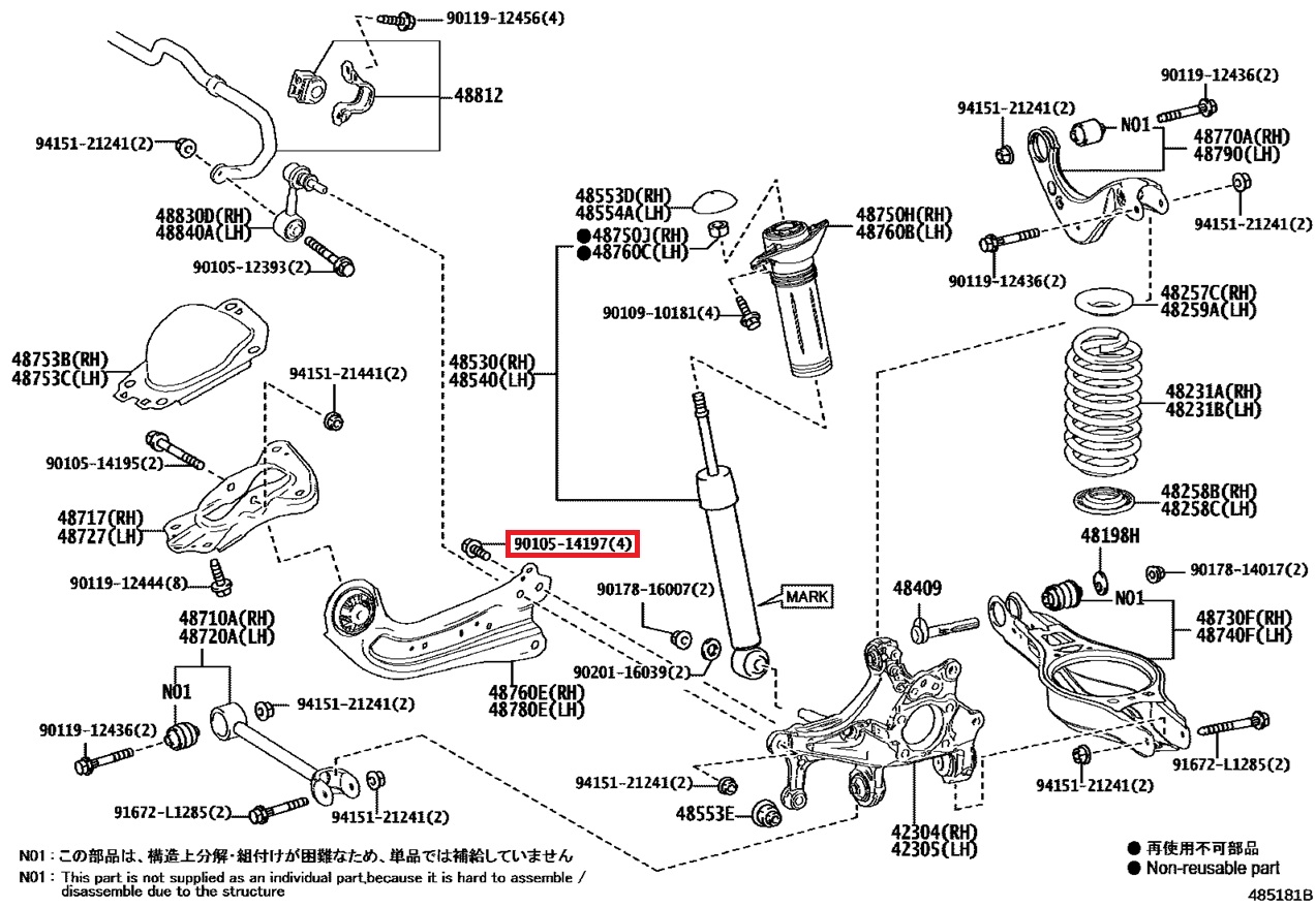 90105-14197 Vis bras longitudinal arrière / porte moyeu arrière GR Yaris