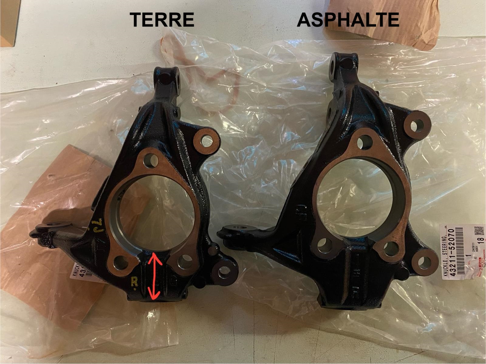 Pourquoi le kit comprend aussi les porte moyeux avant? Car les versions terre permettent une garde au sol plus élevé (la distance entre le centre du moyeu de roue et de la rotule inférieure est réduite de presque 3cm).